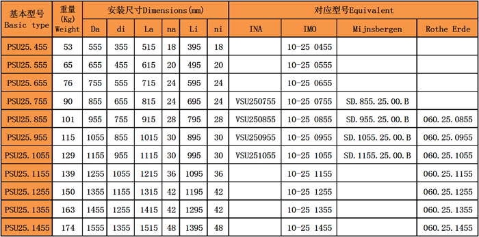 洛陽普瑞森精密軸承(PRS)為用戶提供PSU25系列無齒型回轉(zhuǎn)支承。PSU25系列有良好的承載力以及便于安裝等點(diǎn),歡迎選購。同時(shí),我們也可以根據(jù)客戶自己的需要重新設(shè)計(jì),我們經(jīng)驗(yàn)豐富,產(chǎn)品系列齊,完可以滿足用戶對(duì)標(biāo)準(zhǔn)和非標(biāo)準(zhǔn)軸承的需要,歡迎新老客戶前來訂購。