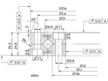 洛陽普瑞森XRSU系列(內(nèi)外環(huán)體型、帶安裝孔、高剛性)交叉滾子軸承可替代INA公司XSU08系列,普瑞森XRSU系列高剛性交叉滾子軸承由于內(nèi)外環(huán)都采用整體結(jié)構(gòu),具有高剛性,并且?guī)в邪惭b孔,安裝時(shí)不需要固定法蘭和軸承座,很大程度簡化安裝程序,并且不影響安裝精度,具有較高的旋轉(zhuǎn)精度和較大的扭矩,同時(shí)也可以根據(jù)精度要求自由選擇內(nèi)圈或者外圈旋轉(zhuǎn)的方式,具有較大的選擇自由度。它與XRU的區(qū)別是密封結(jié)構(gòu)采用雙面彈簧簧片式密封,并且外形尺寸比XRU系列更緊湊,更適合于安裝空間較小的安裝位置。